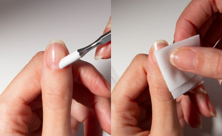 Spingi delicatamente indietro le cuticole utilizzando il bastoncino per manicure incluso o un apposito spingicuticole, rimuovendo lo strato sottile di cuticole dalla superficie dell'unghia per garantire una maggiore durata degli adesivi in gel. Pulisci accuratamente le unghie con il pad di alcol fornito.